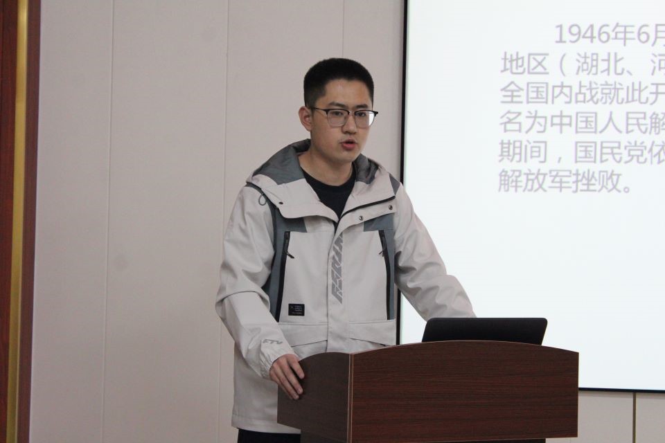 孙福腾、赵凡分别从解放战争、建党历史两个主题作了宣讲。孙福腾通过解放战争的历史背景、战争历程、战争结局三个方面带领大家回顾了解放战争的历史。赵凡则从学习党史的重要性、党史发展的几大阶段、马克思主义的传播、中国共产党的诞生四个方面进行了讲解。