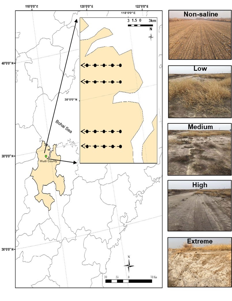 Fig.1. The study region and five salinity gradients with different EC values.