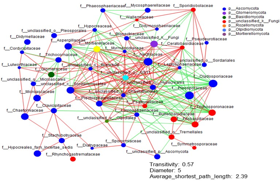 Fig.4. The network analysis of the fungal interactions from non-saline soils to extreme salinity soils.