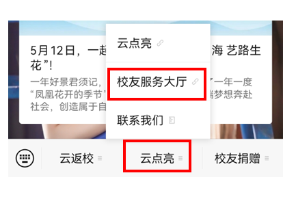 第二步:点击底部菜单栏“校友服务”——“校友服务大厅”。