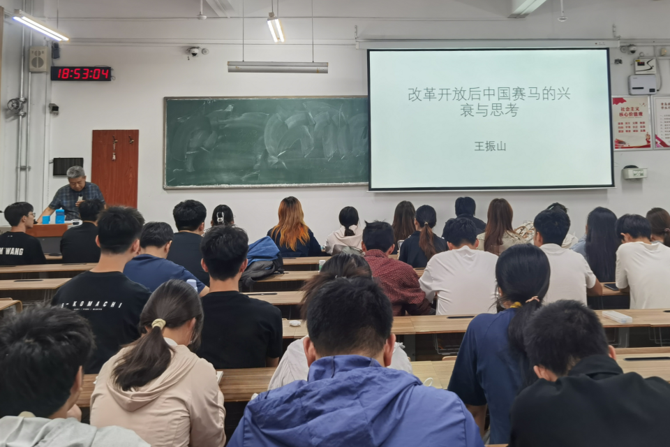 此次讲座以上世纪90年代的广州赛马场、深圳赛马运动俱乐部、北京乡村赛马场三个马场为例,讲述其运营模式、盛况时期的社会经济影响以及最终走向衰落的深层原因,进一步探讨了发展中国特色赛马运动的可能路径。王振山老师提出,未来的发展应当坚持以“马匹福利为核心、法律法规为准绳、人才培养为根基”,探索与旅游文化相结合、与社会发展相融合的运营新模式。他鼓励同学们夯实专业基础,未来在马匹繁育、健康管理、赛事运营、俱乐部管理等细分领域深耕,成为推动行业走向科学化、规范化发展的中坚力量。