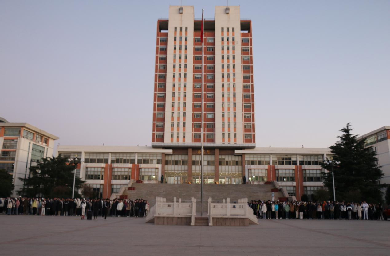 升旗仪式开始,国旗护卫队昂首挺胸,迈着有力的步伐护送五星红旗入场。《义勇军进行曲》响彻虹子广场,全体师生面向国旗肃立致敬,行注目礼,五星红旗冉冉升起。