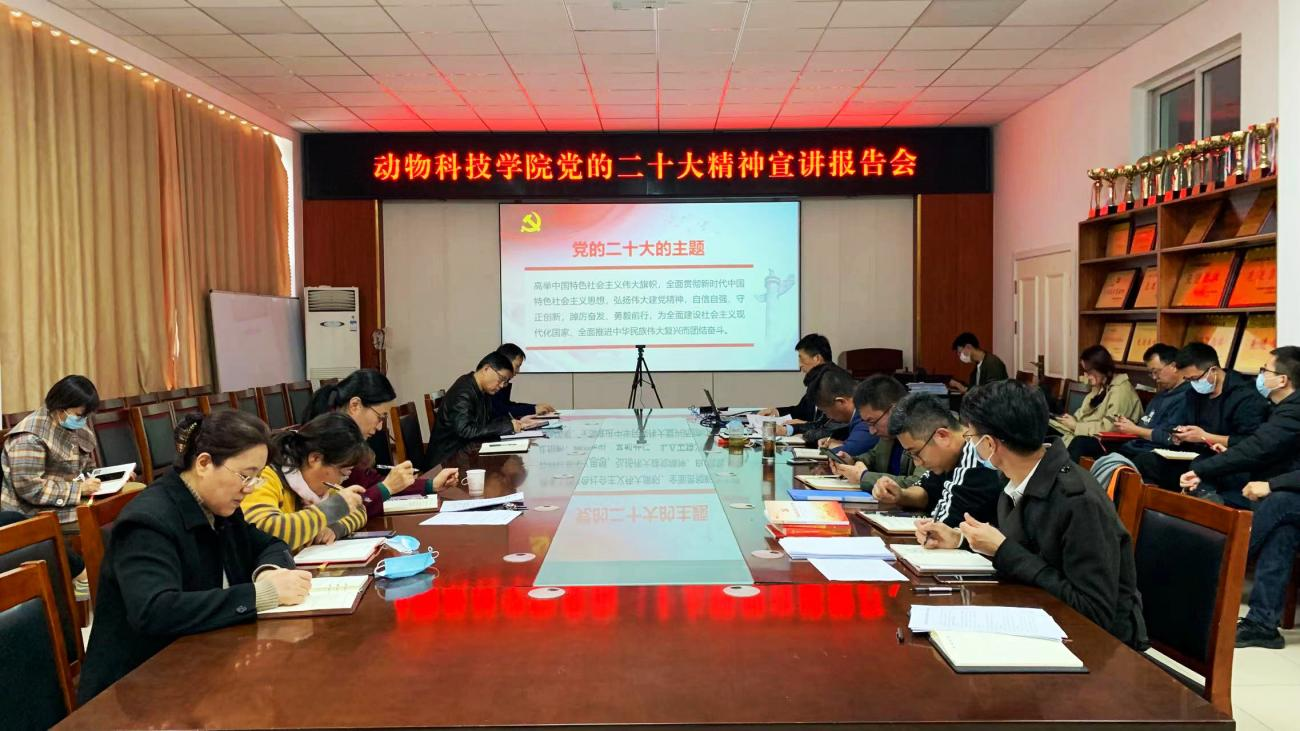 展学斌强调,学习宣传贯彻党的二十大精神是当前和今后一个时期的首要政治任务,学院师生要进一步提高政治站位,原原本本学习报告全文,学深悟透,明确党的二十大提出的各项任务,把学习二十大精神贯彻落实到工作中。要紧密联系实际,以二十大精神为指导,凝心聚力,真抓实干,共谋发展。要抢抓新时代高等教育面临的新机遇,在人才培养、学科建设、科学研究等各项工作中,始终保持昂扬向上、奋发有为的态势,不断推进动科学院高质量发展。