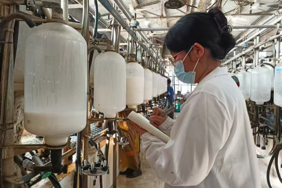 8月10日,团队分批进驻养殖场,开展为期五天的“沉浸式”劳动实践。在奶牛场,动科D2201班李翠玲凌晨四点就起床协助挤奶工作,认真记录每头牛的产奶数据,并主动向师傅请教常见乳房炎防治措施;在闷热难耐的鸡舍中,动科D2201班杨森连续三天跟随技术员学习雏鸡分群与免疫接种,汗水浸透衣衫仍坚守岗位。尽管环境艰苦,却没有一个人叫苦叫累。他们的专业态度和吃苦精神获得养殖场员工的一致赞扬:“这些学生不怕脏、不怕累,是实实在在来学本领、干事情的!”