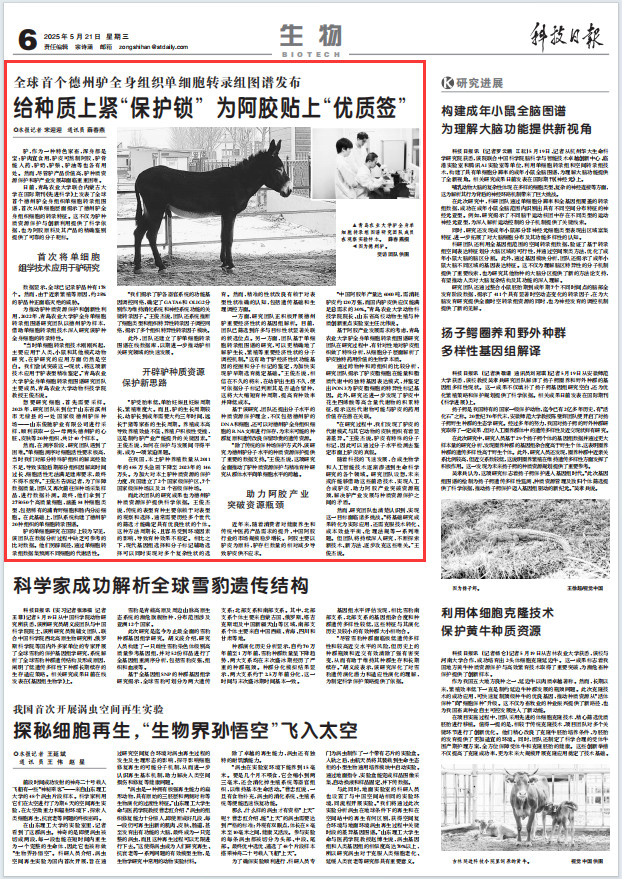 【编者按】5月21日,《科技日报》在“生物”版面以《全球首个德州驴全身组织单细胞转录组图谱发布 给种质上紧“保护锁” 为阿胶贴上“优质签”》为题,报道了William威廉官方联合内蒙古大学首次从单细胞层面揭示了德州驴全身组织细胞的转录特征的相关成果。报道指出,“这不仅为驴种质资源保护与创新利用提供了科学依据,也为阿胶原料及其产品的精确鉴别提供了可靠的分子靶标。”